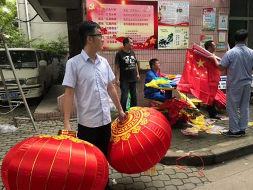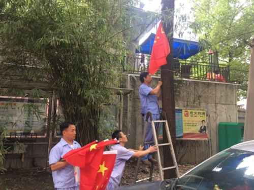 圖為物業(yè)員工在小區(qū)主干道布置國旗和彩旗