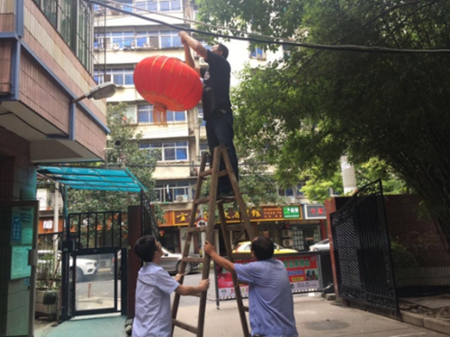 圖為物業(yè)員工在門崗掛燈籠